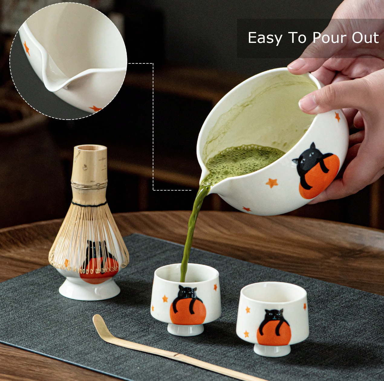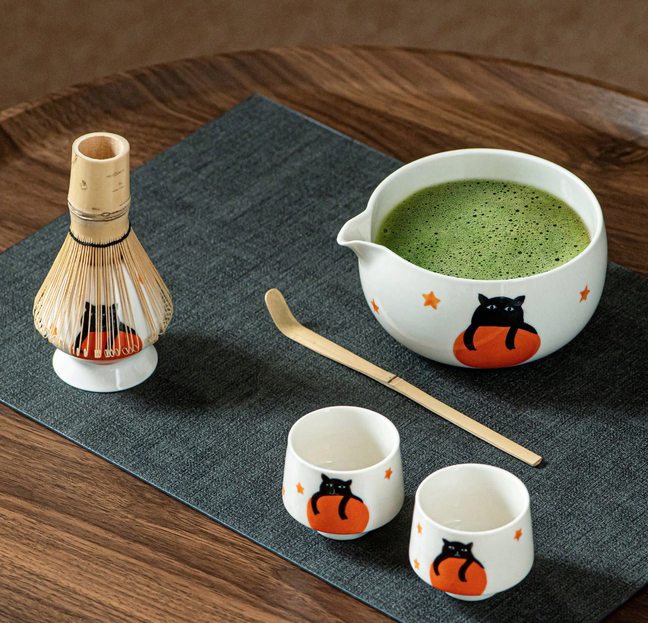 طقم ماتشا لطيف برسومات قط أسود على يقطينة، مثالي لمحبي التفاصيل اللطيفة والطقوس الممتعة. مصنوع من السيراميك عالي الجودة مع تشطيب ناعم.